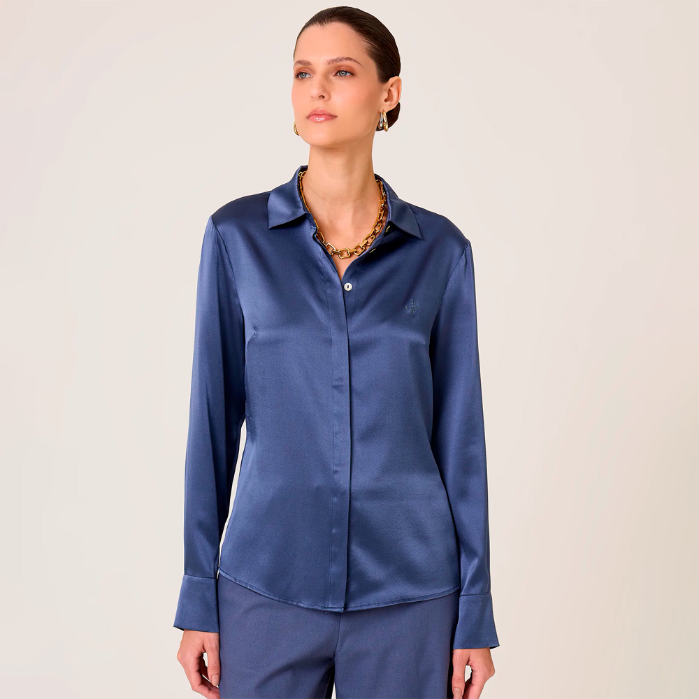 - Camisa feminina confeccionada em tecido de 92% seda e 8% elastano, combinando o toque suave e sofisticado da seda com a leve elasticidade do elastano, que proporciona conforto e excelente caimento;