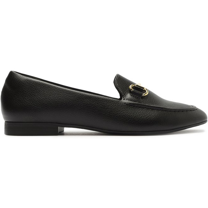 Mocassim feminino Bridão Essencial Preto. Possui bico arredondado e aplicação de bridão metálico na gáspea. Salto baixo emborrachado. Fechado, cobre todo o pé.