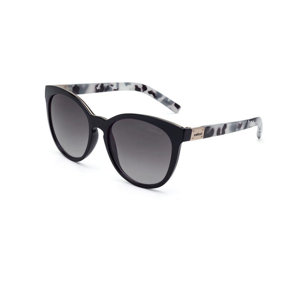 Linha feminina solar com olhos redondos modernos e destaque para o adorno metálico elaborado nas hastes.